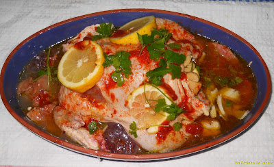 Depois em cima do frango põe-se a polpa de tomate, o colorau, o azeite, a salsa, flor de sal, a margarina e no fim o vinho branco.